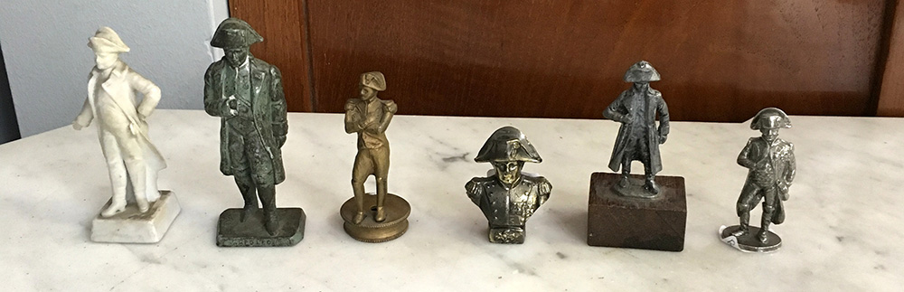 Lotto di sei piccole statuette di materiali vari inerenti alla vita di Napoleone.