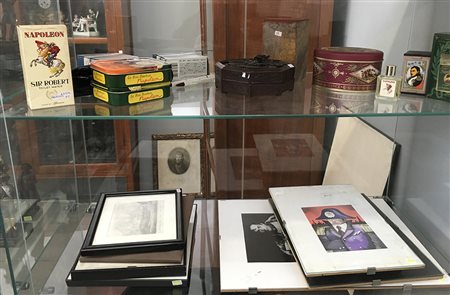 Lotto composto da due scatole di bon-bon, un'acqua di colonia in confezione, due piccoli profumi, due saponi, due penne e una cravatta, 9 cornici contenenti ritagli di pubblicazione ed un cromolito su metallo, un oggetto oerientale tutto inerente alla vita di Napoleone. (difetti)