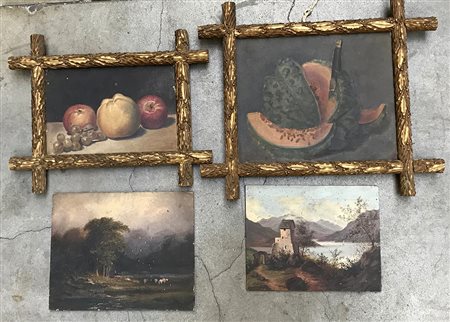 Lotto composto da quattro dipinti diversi, due in cornici (difetti)