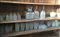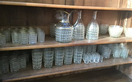 Servizio di bicchieri e da macedonia in cristallo con decori a rombi satinati, piccole foglie e e filettature dorate, composto da quindici bicchieri per acqua e undici per vino, nove bicchieri da liquore alti e quarantasette bicchieri da liquore di differenti altezze, sedici coppe per macedonia di differente capienza, due brocche e due bottiglie. Si uniscono dodici bicchierini di differente decoro (difetti)