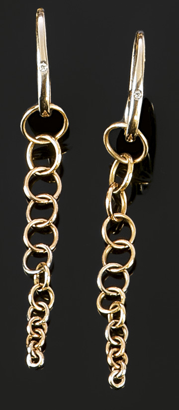 POMELLATO Coppia di orecchini nei tre colori dell'oro, firmati "Pomellato", a maglie circolari concatenate con due piccoli diamanti taglio brillante rotondo Peso gr. 8,4