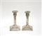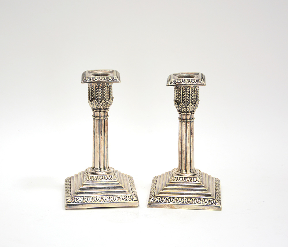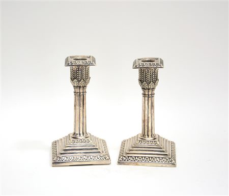Coppia di candelieri in metallo argentato con base quadrata decorati a palmette