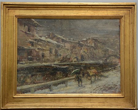 "Naviglio innevato" olio su compensato (cm 39x54) firmato in basso a destra. In cornice (gravi difetti e rotture)