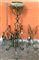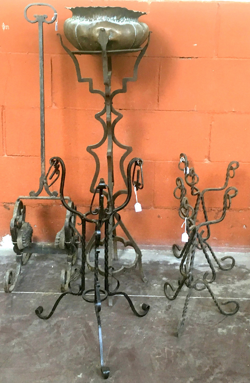 Lotto composto da una fioriera in ferro battuto con vasca in rame, tre trespoli porta vasi e un curioso strumento per la spazzolatura delle scarpe (difetti)