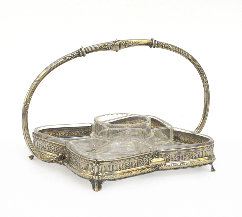 Antipastiera in metallo argentato con cinque contenitori in vetro