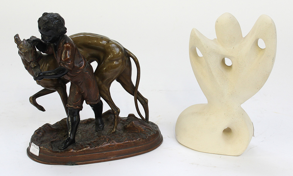 Lotto composto da una figura raffigurante levriero e fanciullo in metallo ed una di forma astratta