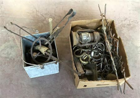Lotto composto da un cartone e una scatola in latta contenente fregi, oggetti rurali in metallo (difetti)