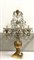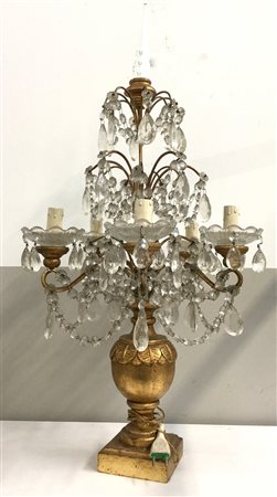 Lampada girandole a cinque luci con fusto in legno dorato, pendagli e bobeches in cristallo (h cm 78) (difetti e mancanze)