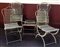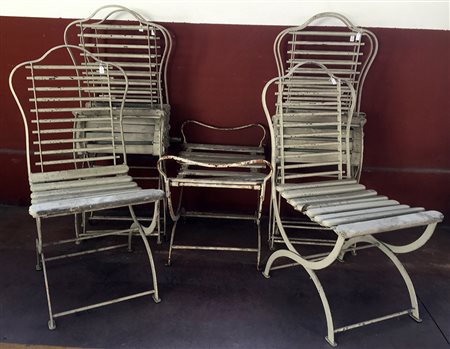 Gruppo di sei sedie pieghevoli verniciate con smalto bianco, struttura in ferro e sedute a listelli in legno, unite a un panchetto di medesima fattura. Inizio secolo XX (difetti e mancanze)
