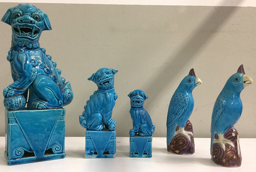 Lotto composto da tre cani di Pho in ceramica blu e una coppia di uccelli a smalti policromi (h max cm 25). Cina, produzione recente (difetti)