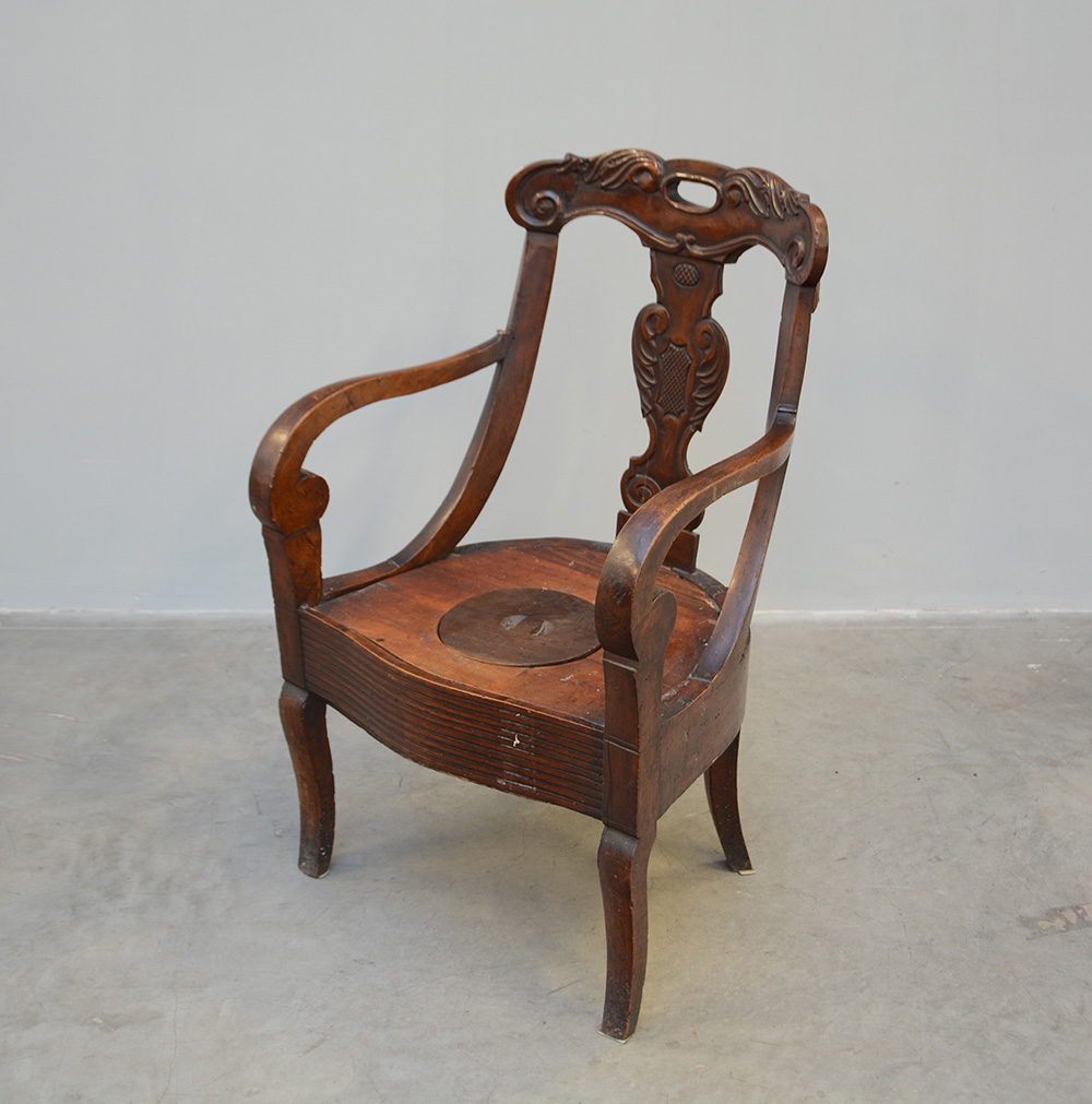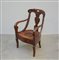 Poltrona comoda in noce con schienale intagliato e traforato a motivi...