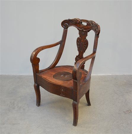 Poltrona comoda in noce con schienale intagliato e traforato a motivi stilizzati. Secolo XIX