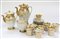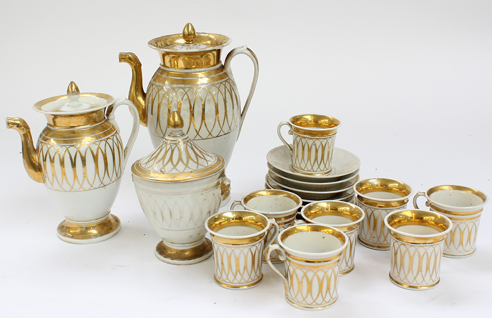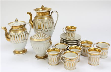 Manifattura di Vinovo, secolo XIX. Parte di servizio da tè' e caffè' in porcellana decorato a dorature. Composto da: teiera, caffettiera e zuccheriera, otto tazze con sette piattini (difetti)