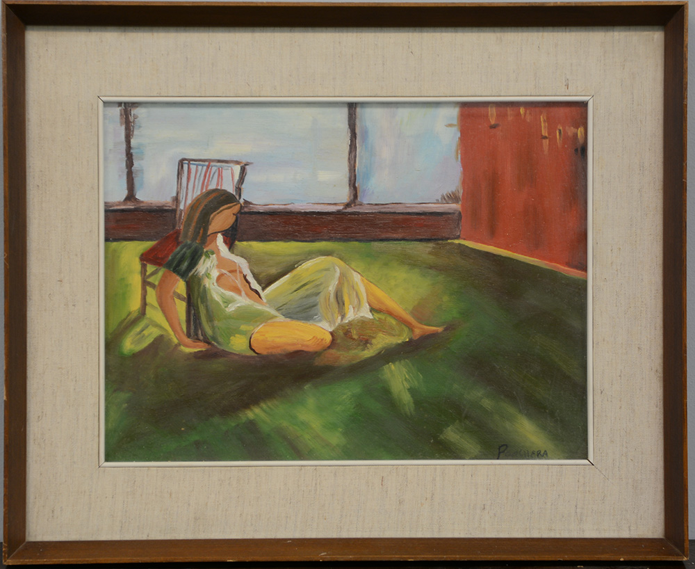"Ragazza seduta", olio su tela, firmato in basso a destra (cm 30x40) in cornice, etichetta sul retro. (Difetti)