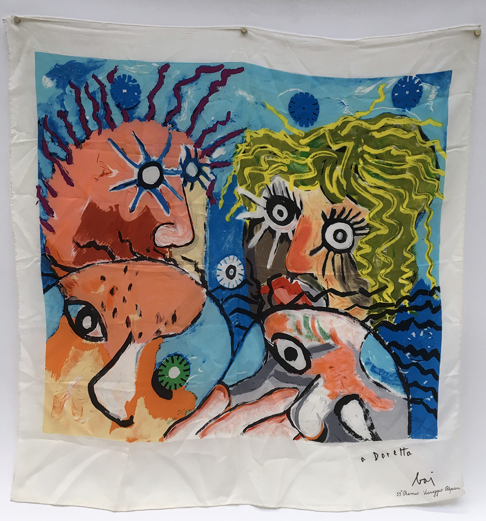 Enrico Baj (Milano 1924 - Vergiate 2003)Foulard in seta raffigurante quattro...