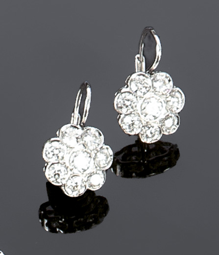COPPIA DI ORECCHINI Coppia di orecchini in oro bianco, a monachella, a forma di fiore con diamanti taglio brillante rotondo per complessivi ct 1,81 Peso gr. 4,00
