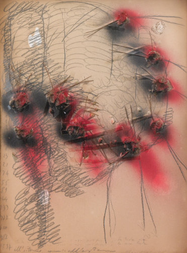 MARIO MERZ 1925 - 2003 ALL'INTERNO COME ALL'ESTERNO signed, titled and dated 78, clay, iron wire, tape, spray paint, glue and charcoal on paper firmato, intitolato e datato 78 creta, fil di ferro, nastro adesivo, vernice a spruzzo, colla e carboncino su carta cm 75x57 Opera in via di archiviazione presso l'Archivo Mario Merz, Torino PROVENANCE Galleria Salvatore Ala, Milano Ivi acquistato dall'attuale proprietario nei primi anni Ottanta