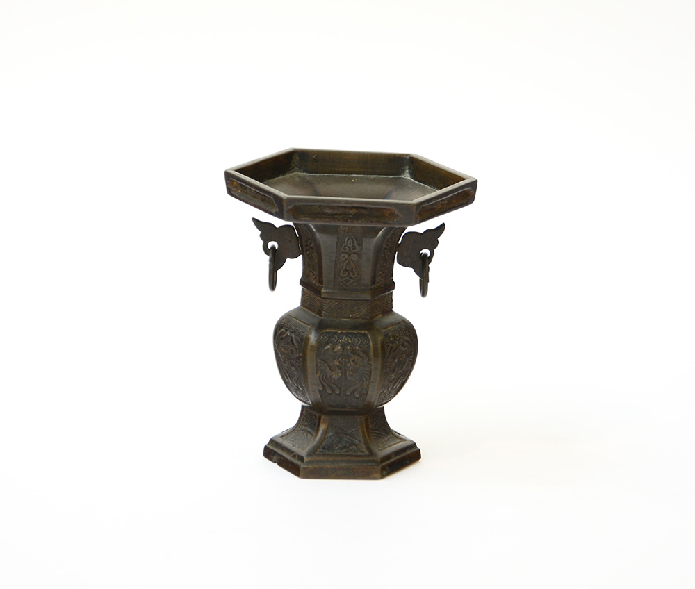 Piccolo vaso in bronzo biansato decorato con coppia di fenici stilizzate (h cm 13) (difetti)