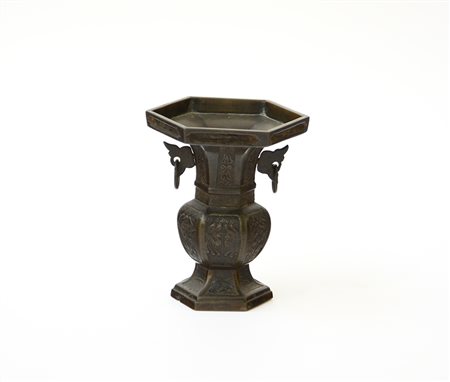 Piccolo vaso in bronzo biansato decorato con coppia di fenici stilizzate (h...