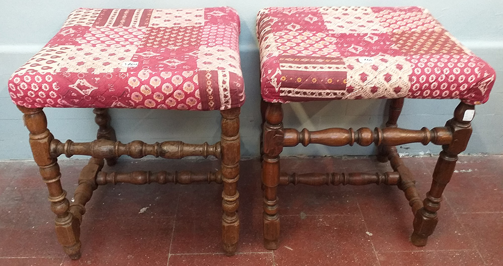 Due sgabelli con gambe a rocchetto (cm 42x50x38)(difetti)