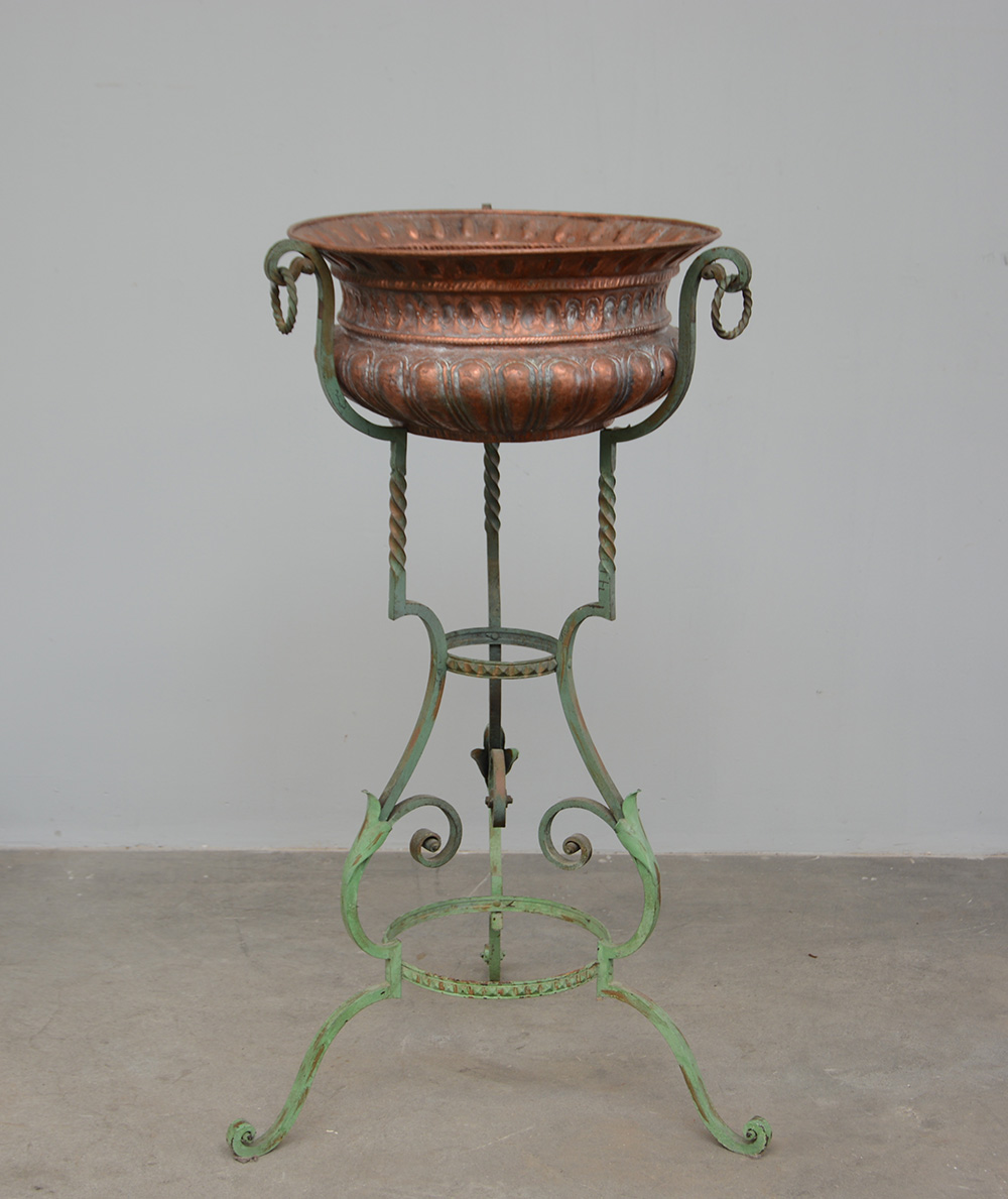 Lotto composto da una base in ferro battuto ed un vaso in rame decorato a baccellature (difetti)