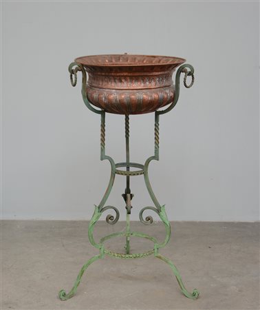 Lotto composto da una base in ferro battuto ed un vaso in rame decorato a...