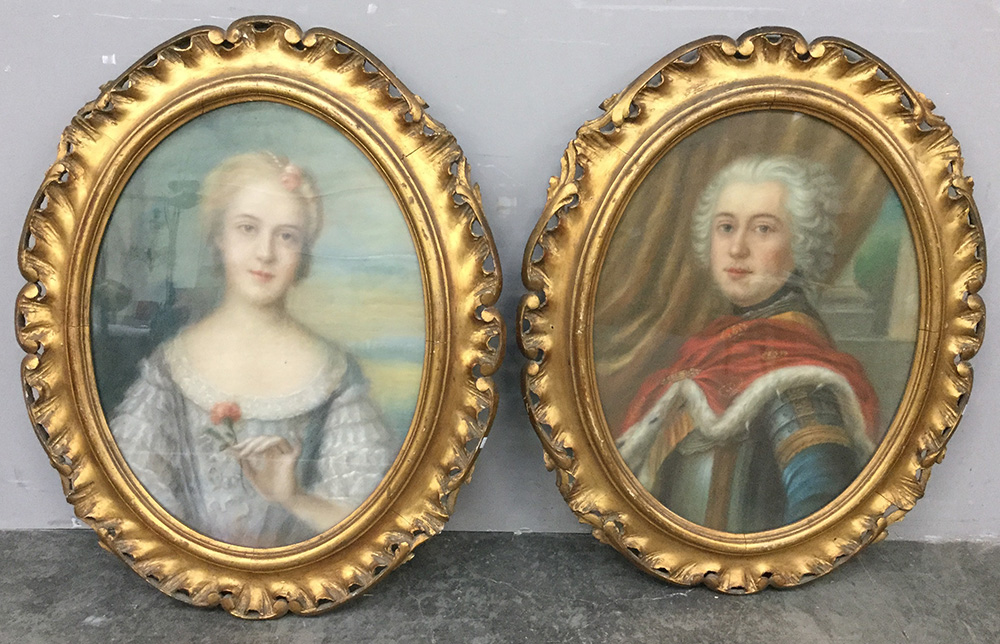 Ignoto, coppia di pastelli ovali su cartoncino raffigurati dama e gentiluomo (cm 62x46), in cornici (difetti)