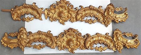 Coppia di mantovane in metallo dorato e sbalzato a volute e fiori. Secolo XIX (largh. cm 150) (difetti)