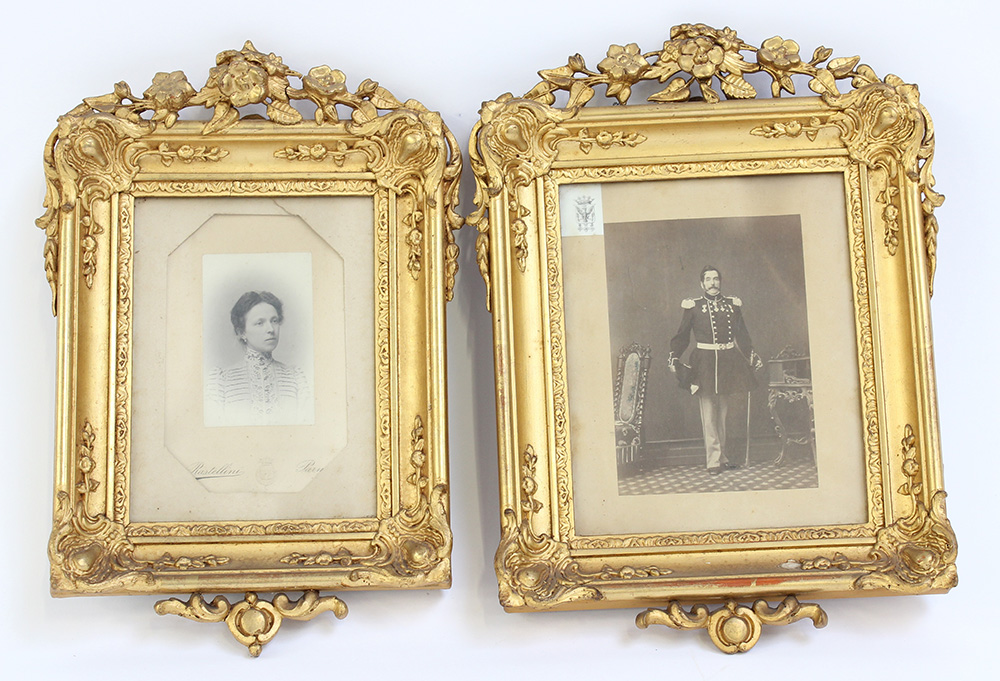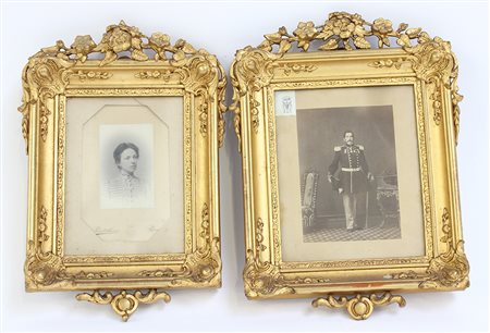 Coppia di cornici in legno e pastiglia dorata contenenti fotografie di ufficiale e gentildonna. Secolo XIX (cm 19x15) (difetti)