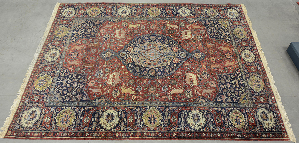 Tappeto Sparta. Anatolia, secolo XX. Disegno a medaglione blu su fondo marrone con scene di caccia. Bordura a testuggine (cm 392x303)(difetti)