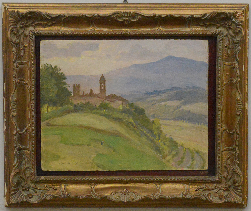 "Paesaggio collinare con chiesa" 1925, olio su compensato (cm 34x45) Firmato e datato in basso a sinistra. In cornice (difetti)