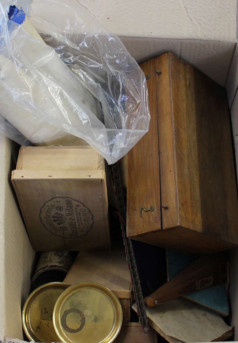 Cartone contenente alcuni giocattoli e oggetti di epoche differenti (difetti)