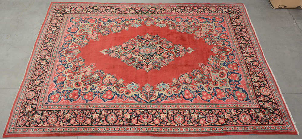 Tappeto Mossul. Persia, secolo XX. Disegno a medaglione policromo a fondo rosso ( cm 419x307) (lievi difetti)