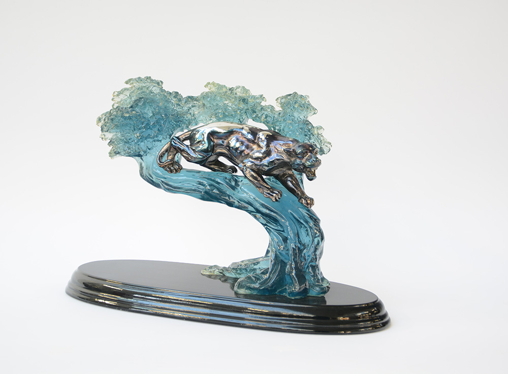Scultura raffigurante una pantera su un albero, resina sintetica e lamina metallica argentata (h cm 31) (lievi difetti)
