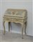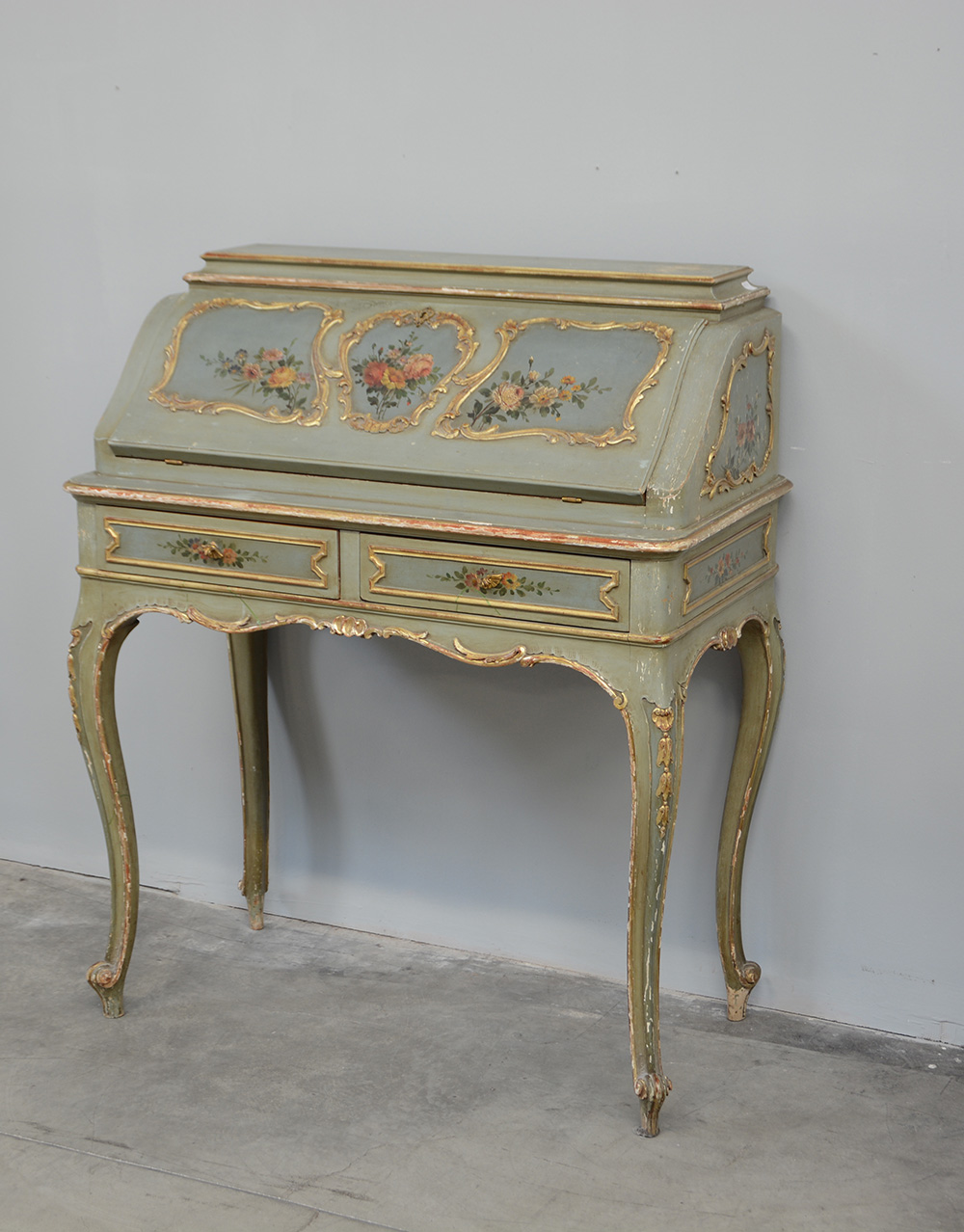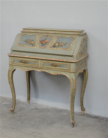 Ribalta in legno laccato e dorato dipinta a motivi floreali in policromia con anta ribaltabile celante vano e quattro cassettini. Due cassetti sottopiano (cm 87x104x46)(difetti)