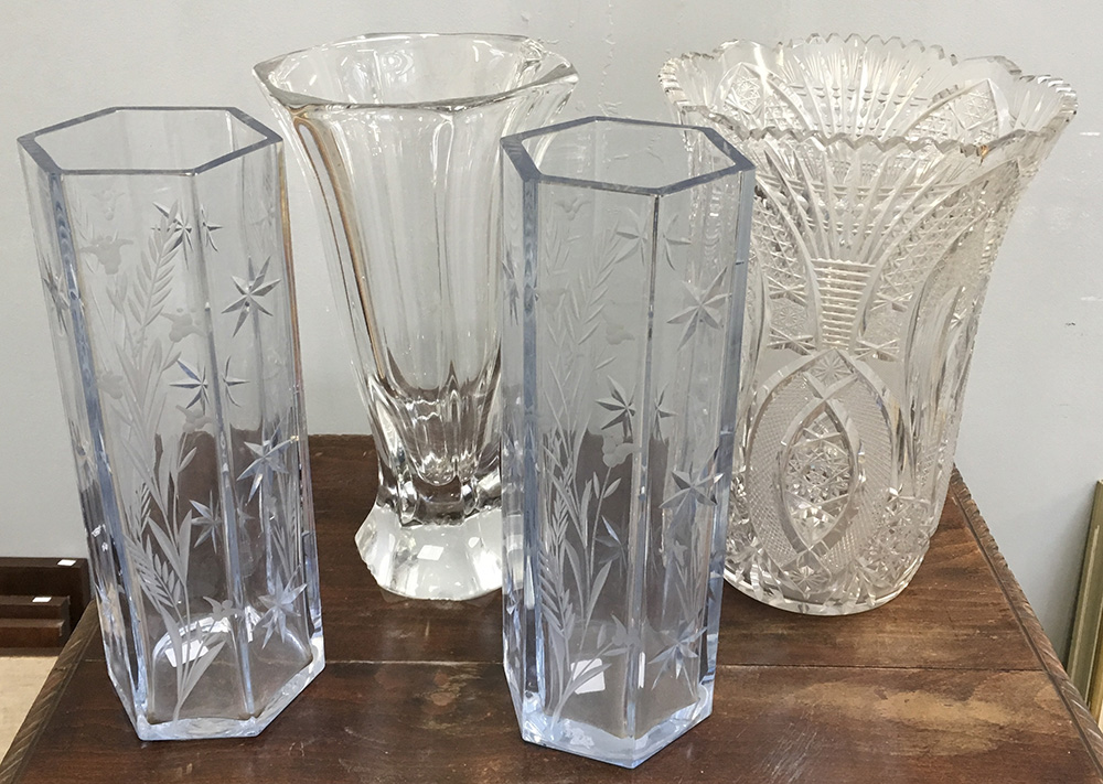 Quattro vasi in vetro e cristallo di decoro e misure diverse (difetti)