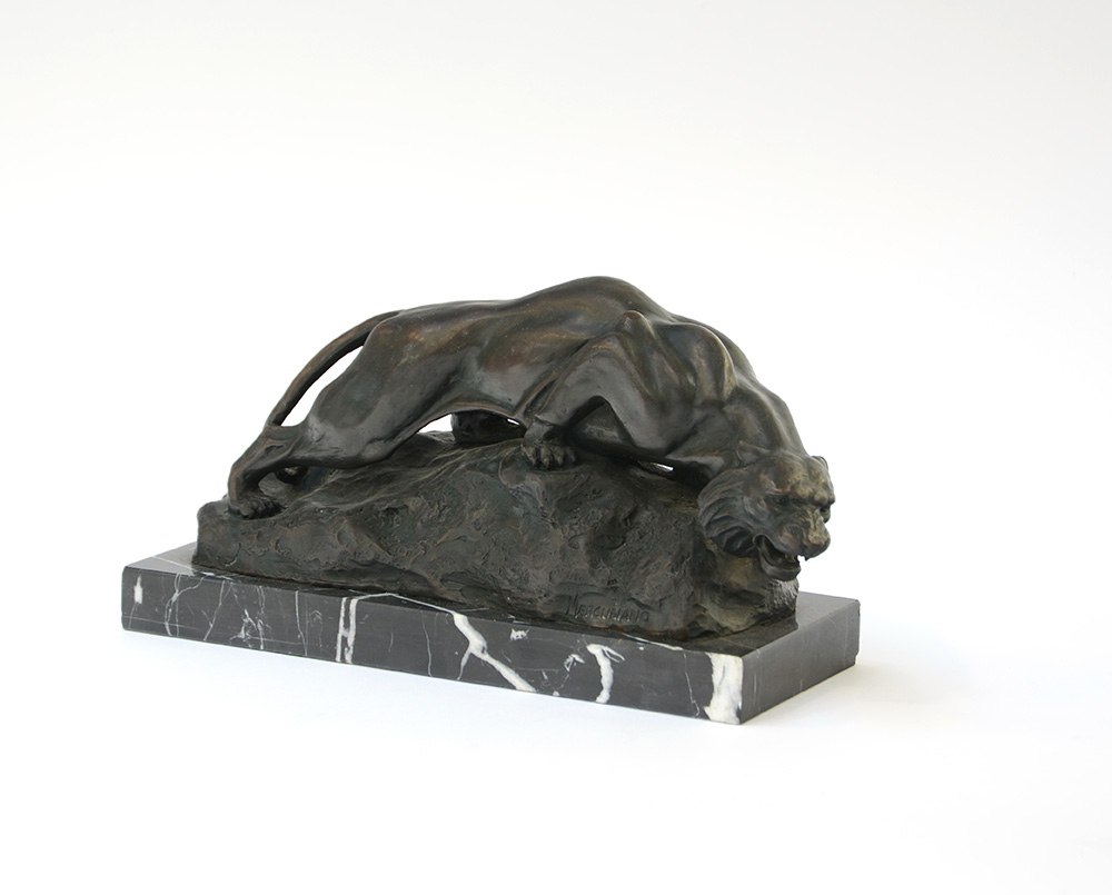 Scultura in bronzo raffigurante una pantera sulla roccia firmata "Merculiano" sulla base (h cm 16 e l cm 33)