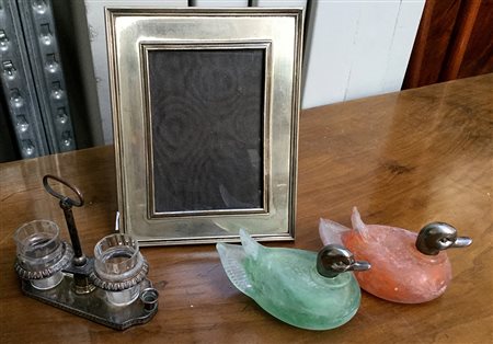 Lotto composto da quattro oggetti diversi in argento, metallo e vetro: una cornice, un piccolo calamaio e due sculture raffiguranti delle papere (lievi difetti)