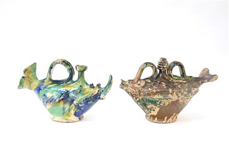 Manifattura dell'Italia meridionale, lotto di due contenitori a forma di pesce in terracotta smaltata (h cm 27, lunghezza cm 42 circa) (difetti e restauri)