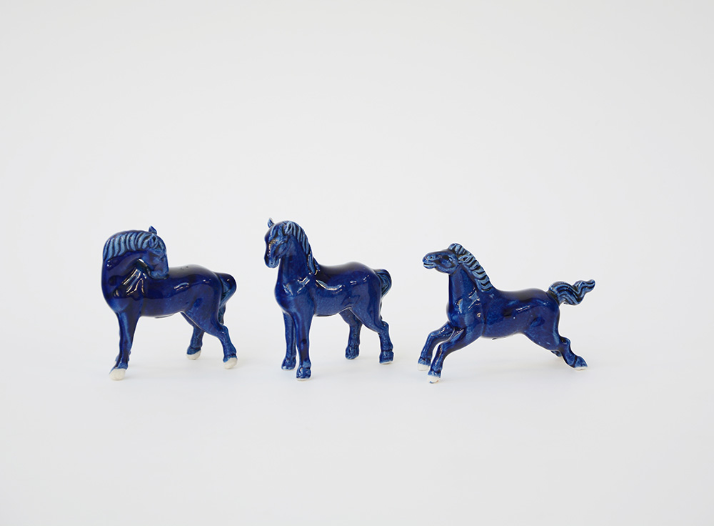 Gruppo di tre cavallini in porcellana smaltata blu (h max cm 8)