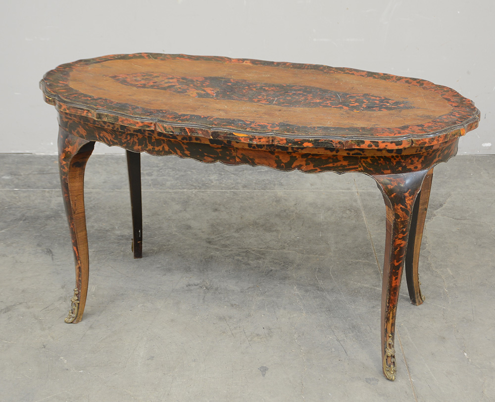 Tavolino da salotto ovale lastronato con piano polilobato e gambe mosse (cm 100x56x52) (difetti e mancanze)