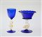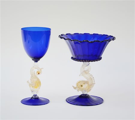 Lotto composto da un alzatina e un calice con coppe e basi in vetro blu e sostegni a forma di cigno e delfino in vetro incolore con inclusioni in oro. Seconda metà secolo XX. (h max cm 23,5) (lievi difetti)