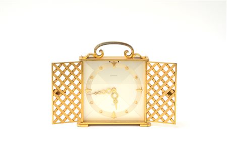 Orologio da tavolo marcato Teriam con cassa in metallo dorato e parte anteriore a due sportelli traforati (cm 17,5x20x6) (lievi difetti)