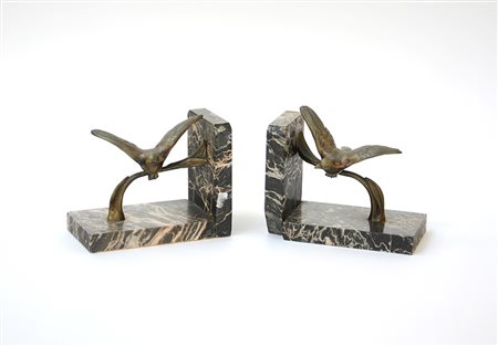 Firma indecifrata, coppia di fermalibri in marmo con uccelli su ramo in bronzo (h cm 13) (difetti e mancanze)