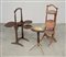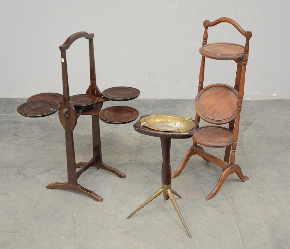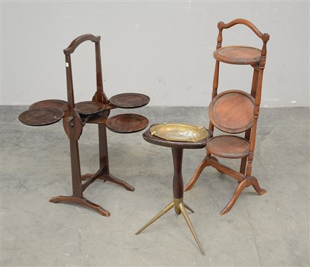 Lotto composto da due tavolini con piani tondi richiudibili e un posacenere tripode da terra (difetti)