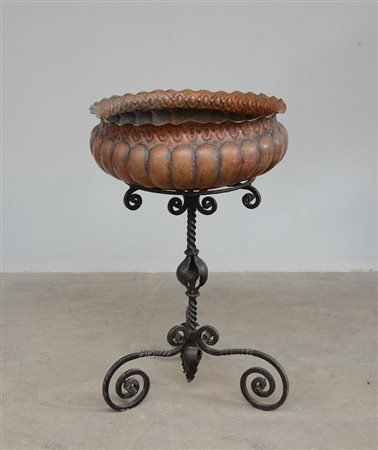 Portafiori con vasca in rame e base in ferro battuto decorata a volute