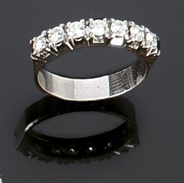 ANELLO Fedina in oro bianco con sette diamanti taglio brillante rotondo per complessivi ct 0,55 ca entro castone quadrato Peso gr. 3,7 Misura 13