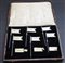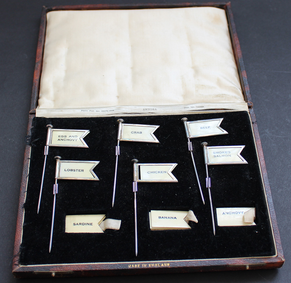 Lotto di sei spilloni segna cibo in argento a forma di bandierina con fascette intercambiabili in resina, in custodia (difetti)