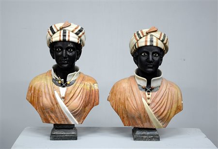 Ignoto, "Mori" coppia di sculture in commesso marmoreo (h cm 72) (difetti e mancanze)