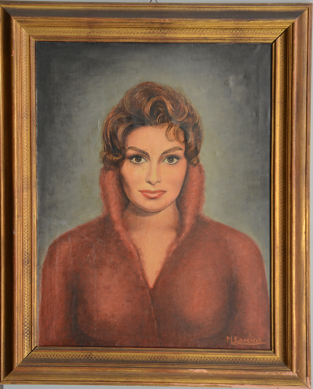 Sarcina M. "Ritratto di signora in abito rosso", olio su tela (cm 68x51),...